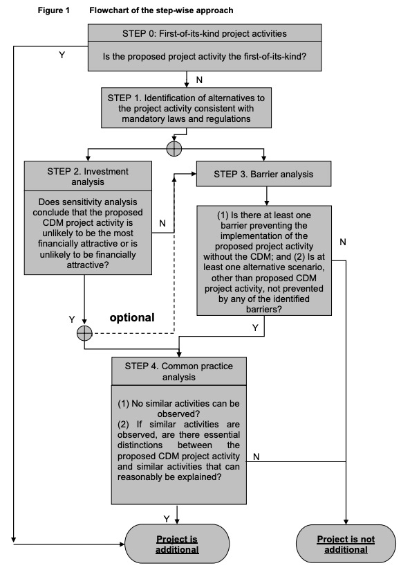 Another standard document, CDM validation and verification standard for project activities, provides a deeper explanation of how entities managing crediting should approach validation and verification of additionality for projects via investment analysis, barrier analysis, and common practice analysis. These concepts are further explored in companion documents including the Tool for the demonstration and assessment of additionality, Combined tool to identify the baseline scenario and demonstrate additionality, Methodological tool - Investment analysis, Guidelines for objective demonstration and assessment of barriers, and Methodological tool - Common practice.